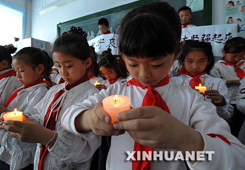 5月19日14時28分,哈爾濱市解放小學的學生在哀悼四川汶川地震中的遇難者