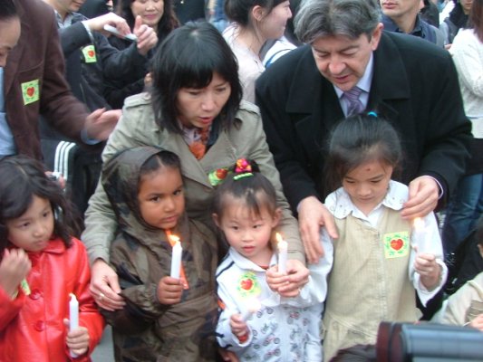 英瑤女士和梅朗雄跟小朋友一起悼念四川大地震遇難者