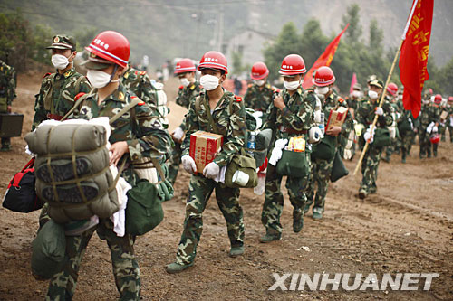 5月26日,武警水電部隊組織431名突擊隊員,身背雷管炸藥,徒步翻山越嶺,奔赴唐家山堰塞湖執行搶險任務。記者岱天榮攝