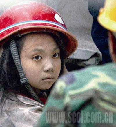 資料圖片:5月13日,在四川綿竹漢旺鎮(zhèn)武都小學(xué)廢墟中,一位等待援助的小學(xué)生望著救援人員。救援人員輕輕為她戴上安全帽。圖片來源:四川在線
