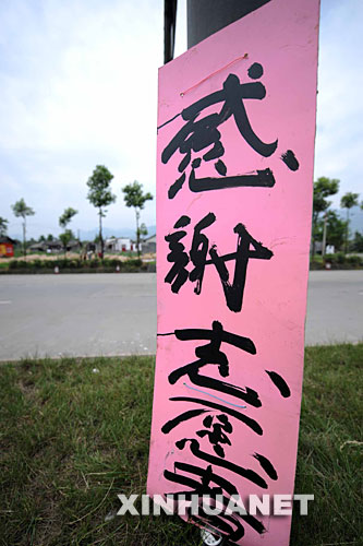 5月19日,一塊寫有“感謝志愿者”的木牌被豎在路中央的隔離帶上。綿竹地震災(zāi)區(qū)部分受災(zāi)群眾自發(fā)在路邊豎起“感謝牌”,表達(dá)對(duì)各界援救的感激。新華社記者王建華攝