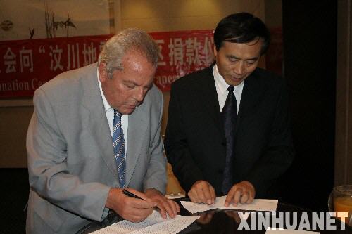 5月30日,在希臘雅典召開的中國船級社地中海委員會2008年年會上,希臘船東卡內西斯(左)為地震災區捐款。當晚希臘船東為地震災區捐款總數達到21.5萬美元。新華社記者梁業倩攝