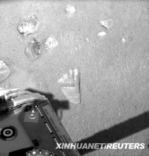 資料圖片:這張圖片顯示的是“鳳凰”號火星著陸探測器的機械臂在火星上留下的“第一痕”?!傍P凰”號探測項目經理戴維·斯潘塞6月1日說,機械臂與火星的第一次接觸為之后的采集土壤和向其他科學儀器傳送土壤樣品做好了準備。由于機械臂形狀特殊,其在火星留下的“第一痕”類似于人類腳印。新華社/路透