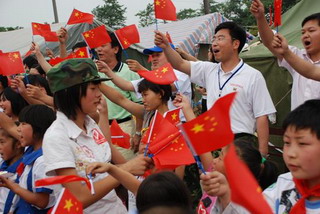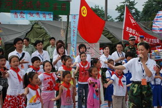 5月30日下午,一個以“有愛就有希望”為主題的別開生面的“六一”兒童節慶祝活動,在洛城村“海河洛城青年家園”舉行。天津青年抗震救災志愿者們在這里與洛城村的小朋友一起慶祝這個特殊的節日。天津市政府國際經濟研究室的路媛和天津電視臺的楊威為孩子們帶來了原創詩詞朗誦《滿江紅·國殤》;天津市公安局的吳楠為孩子們帶來了警體拳;7名醫療衛生和心理康復援助志愿者為孩子們帶來了《讓世界充滿愛》……天津青年宮副主任劉炳源和天津智博通信有限責任公司總經理王宇來了,他們為孩子們帶來了價值8799元的文具用品和一套數字電影播放設備;天津愛樂協會和天津華強工貿有限公司總經理賀強來了,為孩子們帶來了400余冊兒童讀物;天津海泰青年友好使者藝術團副團長莊勇來了,她為孩子們帶來了200余套光盤;北門醫院的天使們來了,她們為孩子們帶來了急需的價值4萬余元藥品;成都世紀同創房地產經紀公司胡杰來了,他為“六一”兒童節出生的洛城村少年兒童曾琴、王勝帶來了生日蛋糕……天津團市委的副書記白鳳祥來了,他為孩子們帶來了70萬天津少先隊員的美好祝愿;什邡團市委副書記許建國來了,他為孩子們帶來了溫馨的祝福……