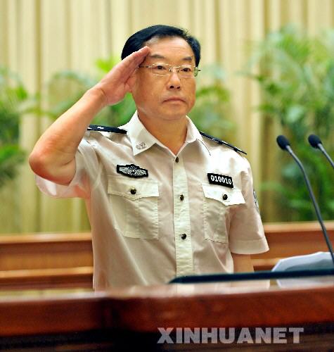 這是黑龍江省哈爾濱市巡(特)警支隊支隊長劉亞民在報告會上發言(6月11日攝)。當日,共青團十六大抗震救災英模事跡報告會在北京人民大會堂舉行。新華社記者 陳曉偉 攝