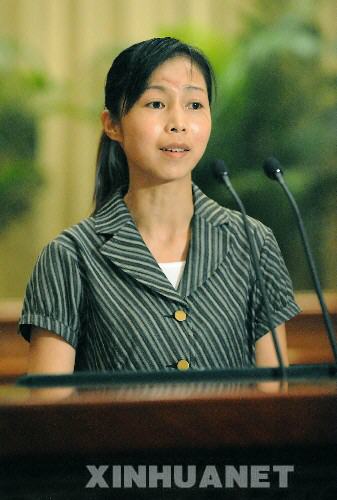 這是陜西省漢中市寧強縣黃壩驛鄉中心學校教師王敏在報告會上發言(6月11日攝)。當日,共青團十六大抗震救災英模事跡報告會在北京人民大會堂舉行。 新華社記者 陳曉偉 攝