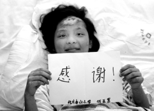 地震發生后,何亞軍和兩名女同學在廢墟下相互鼓勵,一定要挺住。被埋19個小時后,她們被救援人員發現。一位救援人員用長繩綁住礦泉水瓶,緩慢放繩遞給何亞軍,并叮囑她,“孩子,挺住,相信叔叔一定能把你們救出去!”由于亞軍和另一位同學牛鈺恰好是背對背,而牛鈺又被深埋在亞軍斜下方1米多處。她只能往后伸出手臂,拼命后仰傾倒礦泉水,“快喝,牛鈺!”身體后仰使壓著的腿很疼,但她還是不斷地給同學喂水。在被救援的50個小時里,她給同學喂水120多次。何亞軍和牛鈺同時獲救。由于長時間擠壓摩擦,導致何亞軍的右小腿皮膚壞死,嚴重感染,在送往綿陽時,醫務人員建議截肢。經過與第三軍醫大學專家會診后,決定為何亞軍的腿部實施“減壓”手術,清除壞死組織。在醫院,她主動要了一張白紙,寫上兩個大字“感謝!”。她說,感謝從廢墟中救我的叔叔。