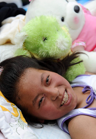 5月12日,四川省青川縣木魚中學初一女生何翠青本已走出宿舍,意識到地震時卻跑回宿舍,將十多名還在午休的同學從床鋪上叫醒逃生,自己卻因失去最佳逃生時間,50個小時后才被救援人員從廢墟中救出,由于重物長時間擠壓,肌肉組織壞死而永遠失去了右腿。 這位堅強的小女孩躺在病床上,全身不能動彈,但仍保持著微笑(5月20日攝)。當記者問何翠青后悔不后悔返回寢室救人,這位救人小英雄說:“不后悔!遺憾的是我沒有救出更多的同學!” 新華社記者 陶明 攝