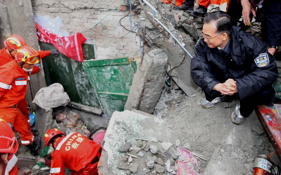 5月13日,溫家寶總理在四川都江堰市新建小學(xué)察看災(zāi)情時,看見救援人員正在教學(xué)樓廢墟里搶救一名被困的小學(xué)生。溫家寶蹲坐在廢墟上對著孩子說,我是溫家寶爺爺,孩子們一定要挺住,一定會得救! 新華社記者姚大偉攝