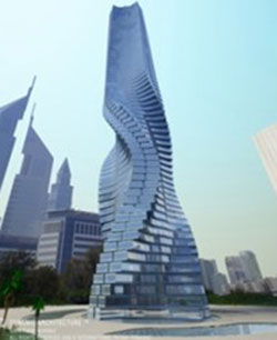 據菲舍爾介紹,“迪拜旋轉塔”高約1380英尺,有80層,每一層都錯落開呈螺旋上升狀,就像一個個圍繞著大樓固定的水泥中心體旋轉的圈,整個大樓看上去就像是在不停舞動的美麗少女,人們在房間中將可以欣賞到持續變化的外部景致,真是妙不可言。大樓中的一些豪華別墅使用的是聲控電腦系統來控制旋轉,其他部分的運動則被設計為持續“舞蹈”,并可以隨著時間變化。