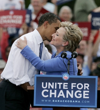 希拉里說話時,奧巴馬就坐在她身邊的高腳凳上。他沒有穿西裝,系著淺藍色的領帶,白色襯衫的袖子還卷了起來。聽到前第一夫人激昂的演說,奧巴馬也對希拉里和她的丈夫、前總統克林頓不吝贊美之辭,稱他們夫妻是自己的戰友和民主黨的頂梁柱。奧巴馬說:“我們需要他們,我們急切地需要他們。不僅是我的競選需要,美國人民也需要他們的貢獻、他們的視野、他們的智慧,因為那就是為什么我們能讓民主黨凝聚在一起,那就是為什么我們能讓美國上下團結。”