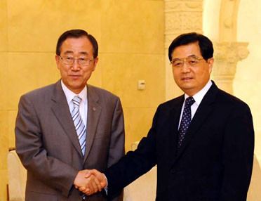 2008年7月2日,國家主席胡錦濤在北京人民大會堂會見來華訪問的聯合國秘書長潘基文。[新華社圖片]