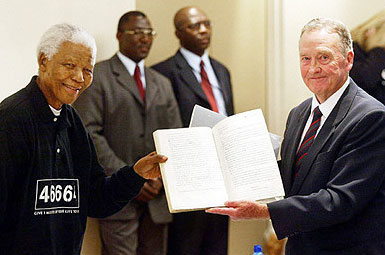 2004年9月21日,前監(jiān)獄警官卡德將兩本珍貴的日記交還曼德拉