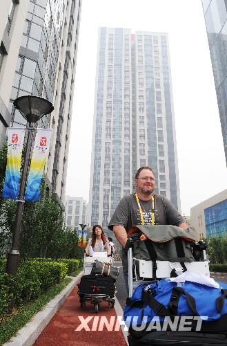 7月25日,兩名抵達北京奧運會媒體村的媒體工作人員前往住處。當日,北京奧運會媒體村開村,開始迎接參加奧運會報道的媒體工作人員。新華社記者徐家軍 攝