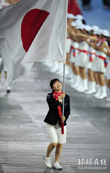 日本代表團的旗手是深受我國人民喜愛的乒乓球運動員“瓷娃娃”福原愛。