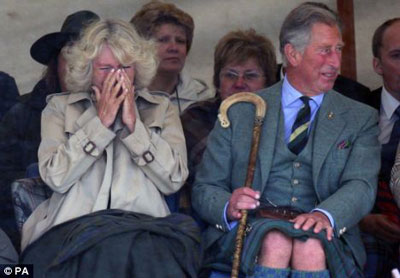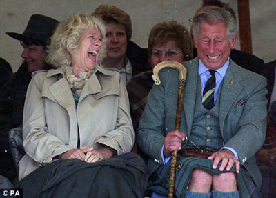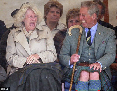 中國日報網環球在線消息:英國王儲查爾斯與妻子康沃爾公爵夫人卡米拉8月9日在參加蘇格蘭高地運動會時成為媒體聚焦的對象,因為二人在看臺上觀看比賽時突然一陣狂風襲來,身穿傳統蘇格蘭短裙的查爾斯害怕“春光乍瀉”,連忙用手捂住裙角,身旁的卡米拉看到了這一幕禁不住竊笑起來,此時忍俊不禁的查爾斯也同妻子一同放聲大笑。