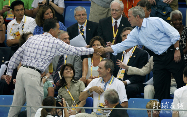 前共和黨總統(tǒng)候選人羅姆尼也來(lái)到北京觀戰(zhàn)奧運(yùn)。