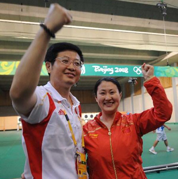 8月13日,中國選手陳穎(左)獲勝后慶祝。當日,在北京奧運會射擊女子25米手槍決賽中,中國選手陳穎以793.4環的總成績獲得金牌。 新華社記者鮑菲菲攝
