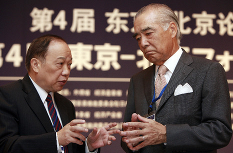 中國日報網環球在線消息:9月15日,在日本首都東京舉行的第四屆“東京-北京”論壇開幕晚宴上,《中國日報》前總編輯朱英璜(左)與日本新一屆中日友好21世紀委員會日方首席委員、論壇日方組委會主席小林陽太郎交談。新華社記者任正來攝