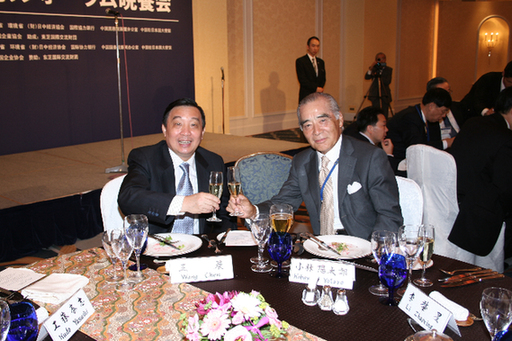 國務院新聞辦主任王晨與新日中友好21世紀委員會日方會長小林陽太郎舉杯慶祝論壇召開