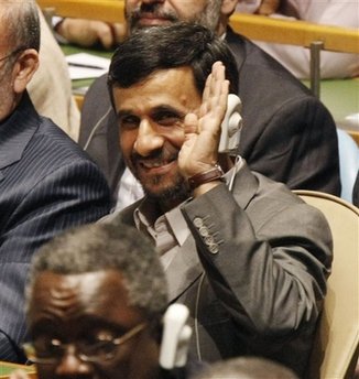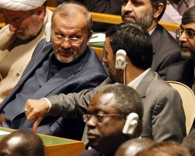 布什開講前,艾哈邁迪-內賈德就擺出了興趣索然的表情。他一邊沖著會議廳里的人們招手,一邊咧嘴微笑。當布什譴責伊朗時,他便轉過身來歪向旁邊一側,攥起拳頭,做了一個大拇指沖下的動作。