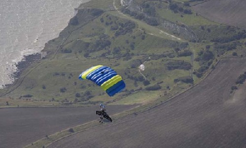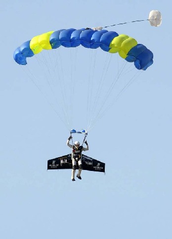 動力翼的兩翼在飛機里是收起的,羅西跳出飛機后,拉動一個繩子,展開兩翼(翼展約為2.4米),緊接著他進行了幾秒鐘的自由落體運動(時速約322公里),然后就開始向水平方向過渡,并以180公里的時速飛向英國,最終羅西成功地打開了降落傘,安全降落在英國多佛爾地區的海岸上。