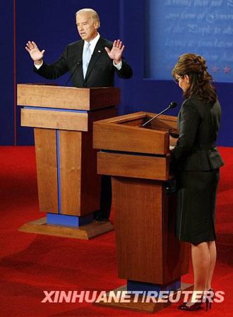 中國日報網環球在線消息:據美國媒體報道,當地時間10月2日晚8時(北京時間3日上午10時),美國副總統候選人辯論會在密蘇里州的華盛頓大學舉行。在外交問題上,民主黨副總統候選人拜登和共和黨副總統候選人佩林就美國的伊拉克政策、阿富汗政策等進行了激烈的辯論。