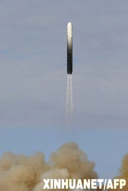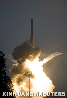 2007年5月29日,俄羅斯軍方在莫斯科以北800公里的普列謝茨克基地成功試射一枚能攜帶多彈頭的新型洲際彈道導彈。俄第一副總理謝爾蓋·伊萬諾夫說,這枚“RS-24”型洲際彈道導彈能穿透任何導彈防御系統。(新華社/英國媒體圖片)