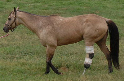 這匹棕色小馬名叫賴利,在2004年的一次意外事故中左后腿嚴重受傷,被人送到懷俄明州“好朋友動物收容所”,那里的獸醫給賴利的左后腿上綁了一塊金屬夾板,希望它幾乎已經斷裂的腿骨能夠重新長好。這塊夾板確實也起到了作用,賴利重新站了起來。