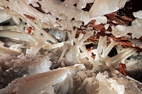 由于這些水晶看上去就如同巨大的冰柱一樣,這張照片可能會讓人覺得洞內(nèi)的溫度相當?shù)停@其實是一種假象。實際上,洞中悶熱難耐,溫度高達112華氏度(約44攝氏度),濕度則在90%至100%之間,因此工人們都穿著防護服,背著裝有低溫氣體的行囊。