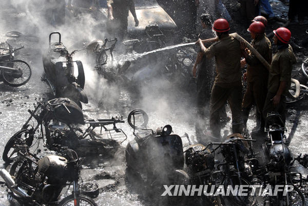 10月30日,在印度東北部阿薩姆邦的高哈蒂,消防人員撲救因爆炸引發的大火。新華社/法新