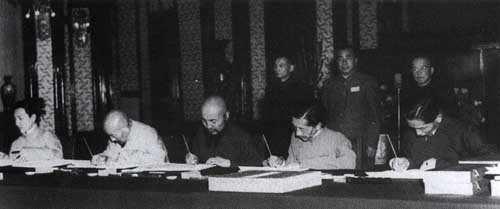 1951年5月23日中央政府代表和西藏地方政府代表在北京中南海勤政殿簽訂《中央人民政府和西藏地方政府關于和平解放西藏辦法的協議》(簡稱“十七條協議”)