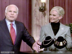 據英國廣播公司11月3日報道,麥凱恩一開始就與自己的“競選搭檔”進行了一番簡要介紹,不過,這位“佩林”其實是由喜劇演員蒂娜?菲扮演的。麥凱恩在這個脫口秀節目中暫時充當了一回QVC (廉價電視購物頻道)的主持人,他首先就拿自己比起奧巴馬少很多的競選經費開涮。