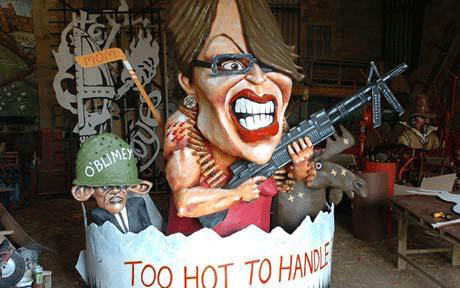 這位阿拉斯加州州長的巨型肖像頗為夸張:她手握一挺機槍,兩臂肌肉發達而強健,嘴唇上涂抹著濃艷的口紅,還露出了惡作劇式的微笑。她的身邊還立著一只美國駝鹿雕塑,身前的標語上寫著“燙手山芋”的字樣。在佩林雕像的旁邊,是民主黨總統候選人奧巴馬的一個小號雕像,他頭帶一頂戰斗鋼盔,顯得大為遜色。盡管下著傾盆大雨,里面填滿了煙花的佩林雕像被引爆后,瞬間就炸得灰飛煙滅。