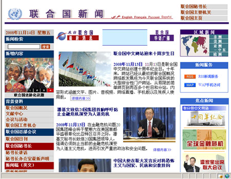 據(jù)聯(lián)合國網(wǎng)站新聞中心報道,1998年11月13日推出的聯(lián)合國網(wǎng)站中文版是最后一個推出的聯(lián)合國官方語言網(wǎng)站。中文網(wǎng)站雖然起步較晚,但在中國及其他會員國的大力支持下,借助聯(lián)合國新聞部的優(yōu)勢和工作人員的多方努力,中文網(wǎng)站迅速發(fā)展。