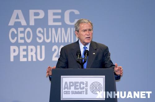 11月22日,在秘魯首都利馬,美國總統(tǒng)布什在亞太經(jīng)合組織(APEC)工商領(lǐng)導(dǎo)人峰會上演講。當日,為期兩天的2008年亞太經(jīng)合組織(APEC)工商領(lǐng)導(dǎo)人峰會在秘魯首都利馬開幕。會議圍繞世界經(jīng)濟形勢和應(yīng)對金融危機等議題進行討論,部分APEC成員領(lǐng)導(dǎo)人出席會議并發(fā)表演講。新華社記者張傳奇攝