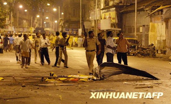 11月27日,警察在印度孟買戈拉巴街區的恐怖襲擊現場警戒。