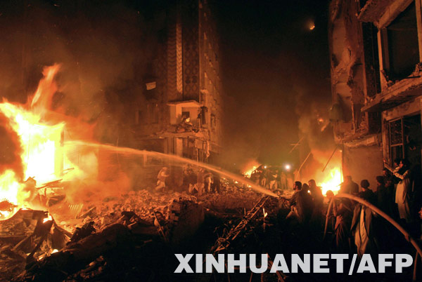 12月5日,在巴基斯坦西北邊境省首府白沙瓦,消防人員在爆炸事故現場滅火。白沙瓦市一個人口密集的住宅區當天發生一起汽車炸彈爆炸,造成至少16人死亡,另有70人受傷。新華社/法新