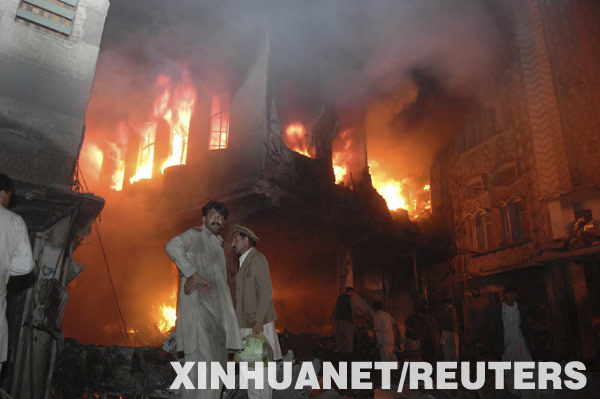 12月5日,在巴基斯坦西北邊境省首府白沙瓦,人們圍觀發生火災的爆炸事故現場。白沙瓦市一個人口密集的住宅區當天發生一起汽車炸彈爆炸,造成至少16人死亡,另有70人受傷。新華社/路透