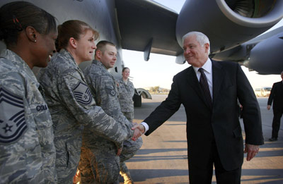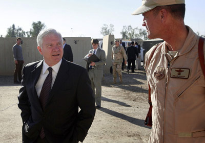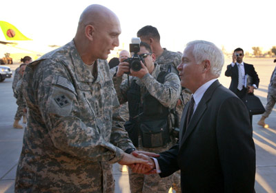 ![]() 美國國防部長蓋茨13日突訪伊拉克,與駐伊美軍最高司令官奧迪爾諾交談。