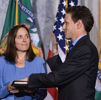 26日,蒂莫西·蓋特納宣誓就任奧巴馬新政府的財政部長,妻子旁邊為他捧著圣經