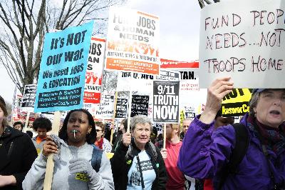 今年華盛頓的反戰示威沒有在19日當天舉行,而是選擇了2天后的周末,因為去年在工作日舉行的反戰活動沒能吸引大量人參加。不過,從19日開始,美國其他地區已陸續舉行了一系列反戰示威活動。