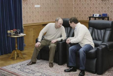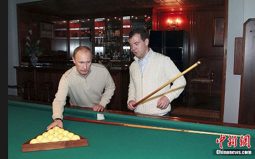 據路透社報道,俄羅斯總統(tǒng)梅德韋杰夫和總理普京3日晚在南部度假城市索契上演了一出令人詫異的“兄弟情”。兩人不但一起打臺球、看電影,甚至還都穿上了一件米色的毛衣。