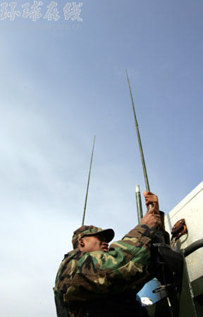 美軍士兵正在調整氣墊船上的通信天線