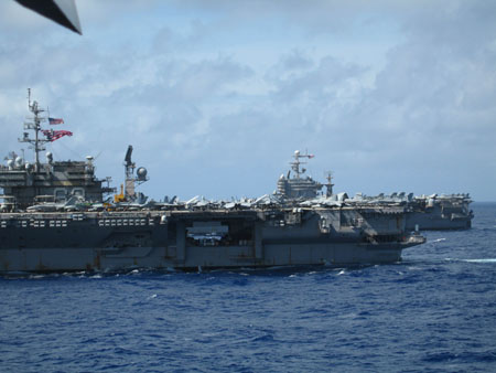 這次代號為“勇敢之盾”聯(lián)合軍事演習(xí),是冷戰(zhàn)結(jié)束以來美軍在亞太地區(qū)最大規(guī)模的海空軍力集結(jié)。參加演習(xí)的航母分別是核動力航母“林肯號”和“里根號”,以及傳統(tǒng)動力航母“小鷹號”。這也是美國在越戰(zhàn)之后,首次集結(jié)三個航母戰(zhàn)斗群在太平洋進(jìn)行演習(xí)。