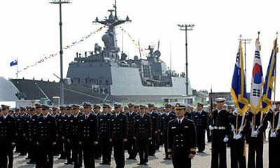 環(huán)球在線消息:將成為韓國海軍主力戰(zhàn)艦的最新型驅(qū)逐艦“王建”號(hào)(4500噸級(jí))日前在韓國海軍作戰(zhàn)司令部鎮(zhèn)海軍港服役。韓國海軍主要官員和600多名官兵參加了服役儀式。