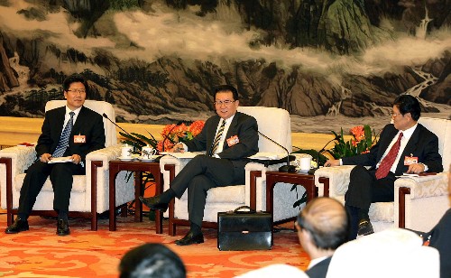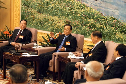 3月8日,中共中央政治局常委、國務(wù)院總理溫家寶參加十屆全國人大四次會議新疆代表團(tuán)審議,聽取代表們的意見。