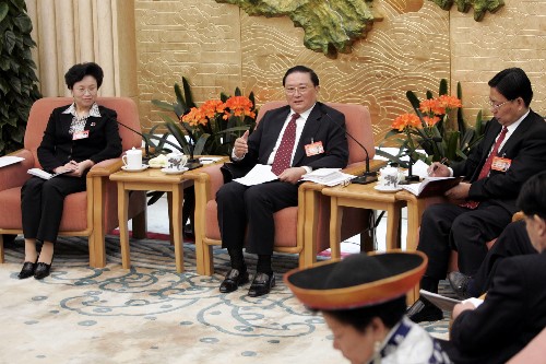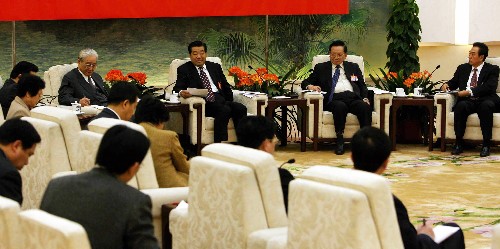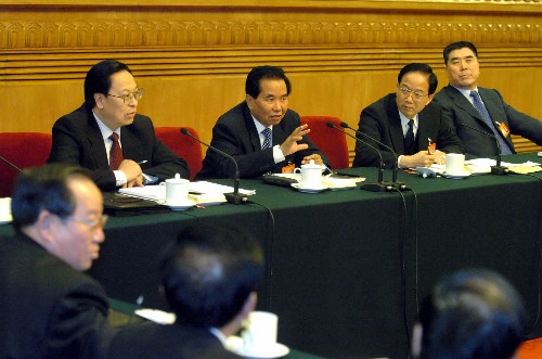 3月8日,中共中央政治局常委、全國政協(xié)主席賈慶林參加十屆全國人大四次會議臺灣代表團(tuán)審議。 新華社記者劉衛(wèi)兵攝
