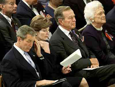 布什、第一夫人勞拉·布什、老布什、芭芭拉·布什(從左往右)。雖為一家人,但關(guān)系復(fù)雜微妙。