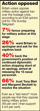 英國政府爭取用外交手段解決“水兵危機”的做法也得到了英國民眾的認同。《星期日電訊報》刊登的一項民意調查顯示,絕大多數英國民眾不希望采取軍事行動來解決扣押事件。